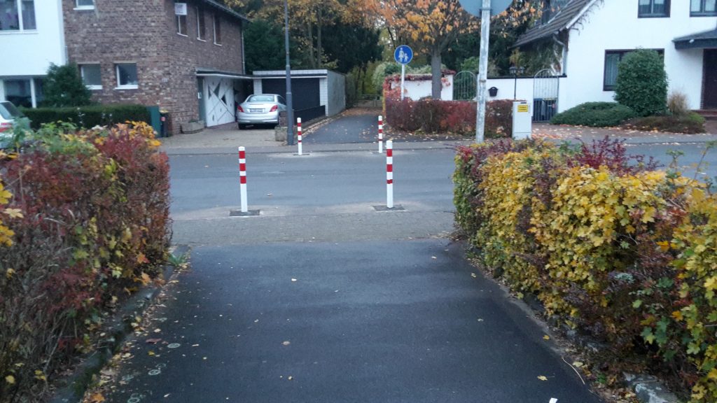 Die Passanten (Hundehalter, Schüler, Spielplatzbesucher), die täglich die Straße queren nehmen die Pöller als eine gute Maßnahme wahr, da der Slalom um die geparkten Fahrzeuge entfällt und der fließende Verkehr besser einsehbar ist.